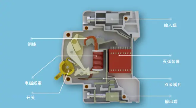 这两种脱扣机构在断电过程中,也都会产生电弧,这就需要将其迅速熄灭,当电弧产生后就会进入到由很多绝缘材料组成的隔断中,首先实现对电弧的分割,当电弧继续沿着隔断前进时,就会变得越来越弱,最后完全熄灭在灭弧装置内。