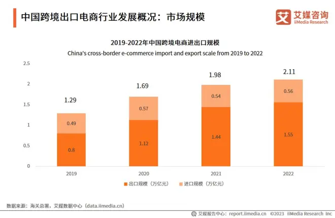 近年来,跨境电商作为迅猛发展的一种商业模式,借助互联网的便利性和全球物流的高效性打破地域限制,中国“买全球、卖全球”方面优势和潜力被持续释放。在进出口结构方面,目前中国跨境电商仍以出口为主。数据显示,2019-2022年中国跨境电商出口规模逐年递增,2022年已达1.55万亿元。跨境电商促进国际贸易合作和经济发展,为各国带来新的商机和就业机会,助推中国企业出海。