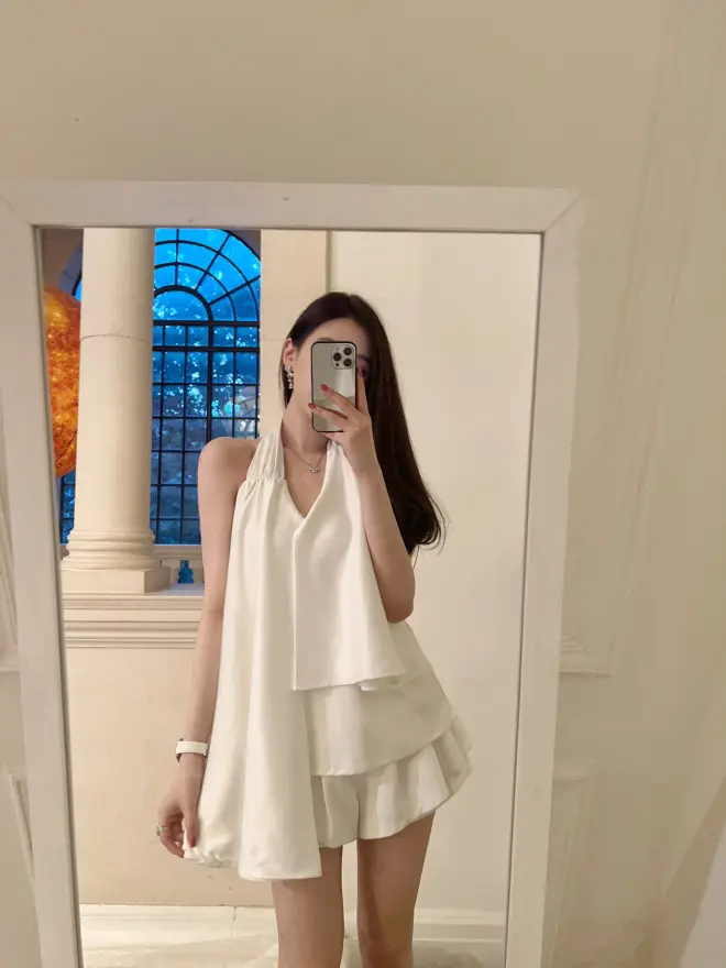 nicky 清冷少女白色缎面挂脖上衣女夏设计感高级感无袖2022新款的评论 (共