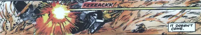 一名士兵倒在嚎叫面前,恐惧和沙尘让他喘不过气。当他勉强瞥见这发疯的金属怪物,他动摇了。此刻,他是一名丈夫,亦是一名父亲。他的脑海中已失去了战斗的职能,他只知道他最爱的两人在等他回家。士兵闭上眼,他感到沙暴和金属关节活动的声音塞满了他的耳朵,越来越近,越来越近。突然,世界安静了下来。良久,他才敢睁开眼睛,先前发生的事情好似一场幻梦。一个巨大的蓝色身影缓缓隐在沙暴之中;他小小的脑瓜努力拼凑着眼前的信息。最终,他得出结论,这一定是中暑导致的。沙暴的另一头,幻影、大汉和开路先锋组成的B小队继续追捕被幻影击中的嚎叫。