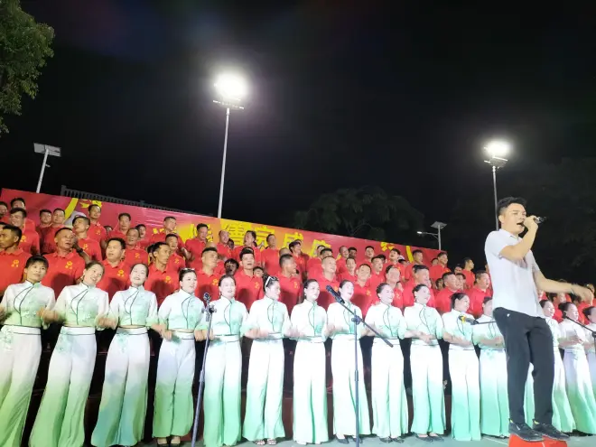 7月12日晚,实践队队员驱车前往漾月村参加“漾月塘修缮完成庆典”。未见其人便先闻其声,在距离漾月村约四公里时,实践队队员便已听到了欢快的歌声。在泥墙残瓦的老房和翻盖一新的新房并存的背景里,露天戏台上的演员们动听的歌声、热情的舞蹈、灿烂的笑容,一首首儋州人民耳熟能详的歌曲,引得台下的观众热情应和。调声的队伍时而呈半圆形,时而呈圆形,时而又呈一字排开。一人领唱,一人指挥,众人同声附和。现场的氛围让人忍不住赞叹。队员置身其中,虽听不懂其中的深意,但仍不由得被那种纯碎得欢快喜悦所感染。村民们唱的不仅仅是调声和山歌,更是他们对新生活的态度,对新时代的向往。