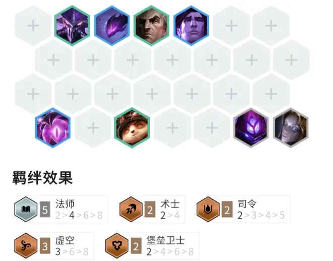 7人口时全换成法师牌如上图所示:大眼、提莫、玛尔扎哈、发条、卡萨丁、乌鸦、宝石组成4法师2术士2司令3虚空2堡垒卫士的羁绊,也可以下卡萨丁、玛尔扎哈上岩雀、琴女开四术士,有拉克丝就上拉克丝开六法。