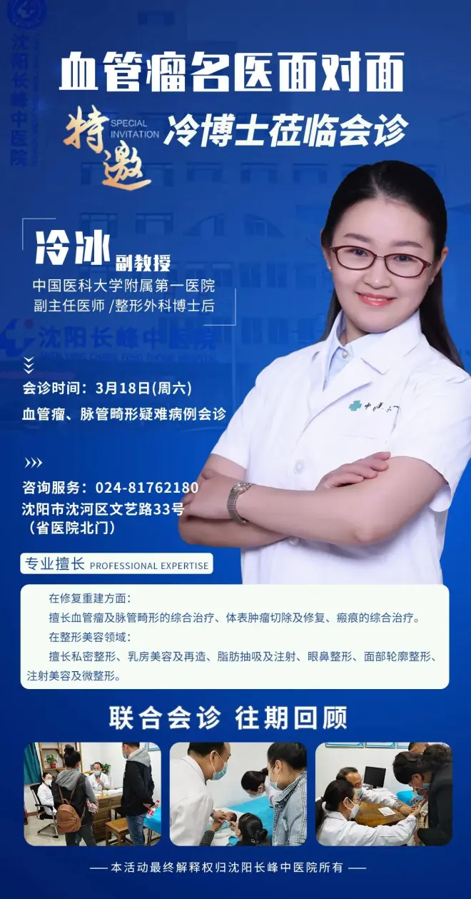 本周六!我院特邀中国医科大学附属第一医院 副主任医师 冷冰副教授莅临,与我院魏新乾院长、于常龙业务院长联合会诊,助力血管瘤患者科学祛瘤。