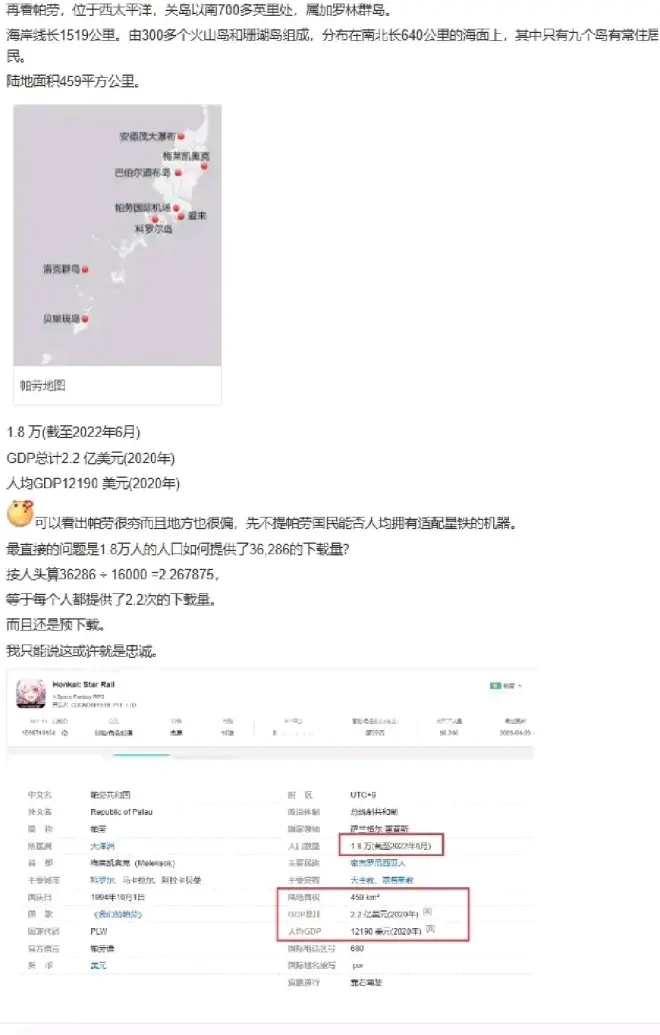 太厉害了XDM! 咳咳,不必多说,这篇文章对标对象就是那些使用夸张的数据美化《崩坏星穹铁道》(以下简称崩铁)这款游戏的。首先,本人并未对此游戏进行游玩。意见仅代表个人观点,如触碰到其他人利益,我会光速磕头认错。 首先就是贴吧老哥讨论的区区1.8万人口的大洋洲岛国帕劳为崩铁献上了3.6万的预下载量。