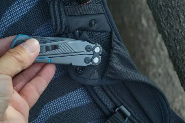 高弹性网袋,非常实用的一个设计。肩带上还留有一个狭长的快开高弹性网袋,登山时可以放点能量棒或者多功能钳,应急使用非常好。如果是城市通勤使用,我觉得可以放一支战术笔,这样可以非常方便取出来,平时不用也比较低调,不引人注意。官宣可以放一部手机,现在都是大屏机,压力还是非常大的。
