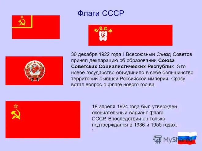 在这一年,俄罗斯苏维埃联邦社会主义共和国(RSFSR)与乌克兰苏维埃社会主义共和国SSR,白俄罗斯苏维埃社会主义共和国SSR和 南高加索苏维埃联邦共和国(TSFSR)合并为一个联盟国家 - 苏维埃社会主义共和国联盟(苏联USSR)。苏联国旗在1924年的苏联宪法中被描述为一种红色或猩红色的矩形布,宽长比为1:2,“在金色镰刀和锤子的杆子的上角有一幅图像,上面是一颗红色的五角星,由金色边框框住。它由所有苏联海船和内河船只携带,并由苏联外交使团使用。30 декабря 1922 года РСФСР объединилась с Украинской ССР, Белорусской ССР и ЗСФСР в союзное государство — Союз Советских Социалистических Республик (СССР). Государственный флаг СССР был описан в Конституции СССР 1924 года как красное или алое прямоугольное полотнище с отношением ширины к длине 1:2 «с изображением на его верхнем углу у древка золотых серпа и молота и над ними красной пятиконечной звезды, обрамлённой золотой каймой». Его несли все советские морские и речные суда и использовали дипломатические представительства СССР.