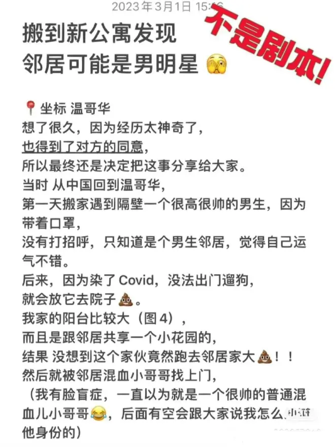 近日,坐标温哥华,一篇“搬到新公寓发现,邻居可能是明星”的文章在社交网络流传开来。