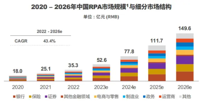 报告中基于“DTE矩阵”强调从RPA应用发展的宏观技术视角观察行业现状和发展机会。当前,中国RPA的产业渗透率为13%,但是未来5年的RPA渗透率拥有较大的提升空间,使中国RPA市场获得持续增长,其增速将远超整体软件市场。在提质增效的社会发展共识下,预计至2026年,中国RPA市场规模将达149.6亿元。