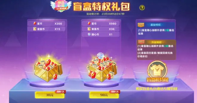 基础特权(购买30元礼包激活):在潮牌盲盒机活动中,触发随心抽时,将会获得额外两组随心抽备选选项;