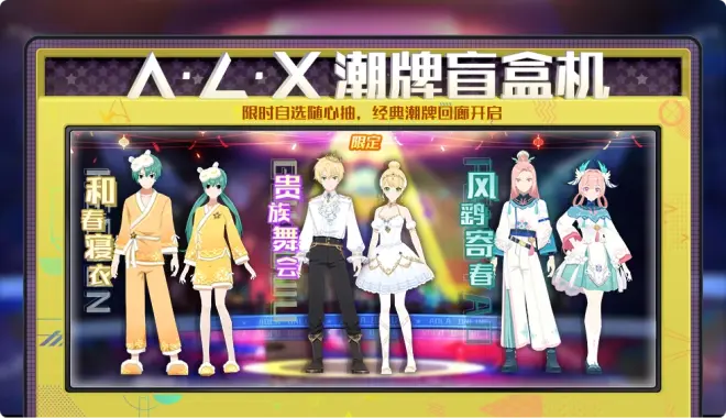 1.全新传说套装【贵族舞会】【风鹞寄春】【和春寝衣】和新系列时装加入奖池,开启选盒即有机会抽取系列潮牌时装,单抽消耗1个盲盒币,十抽消耗9个盲盒币,盲盒币可消耗100星币或购买版本超值礼包获得~上一期潮牌盲盒机获得的盲盒币、时尚纽扣和随心币可保留使用~