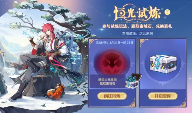 1.活动期间参与试炼玩法—次元黑洞,挑战成功即可获得对应的宙域石,消耗宙域石即可在恒光宝库中兑换奥拉辉石等各种丰厚奖励;