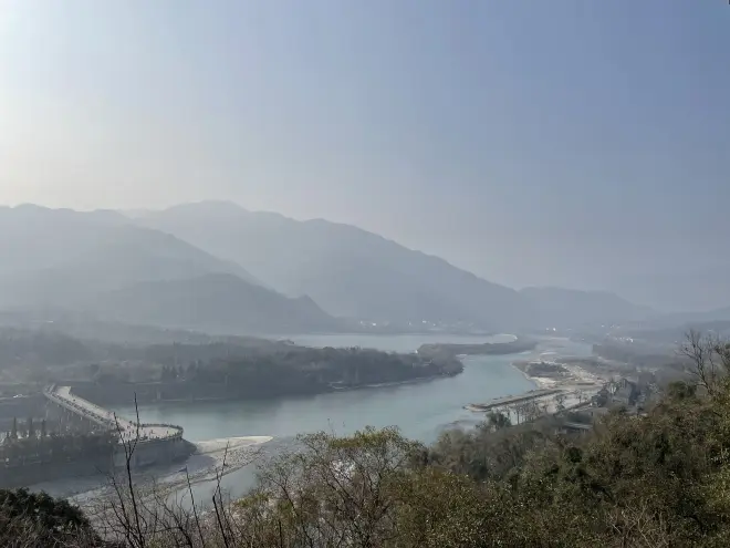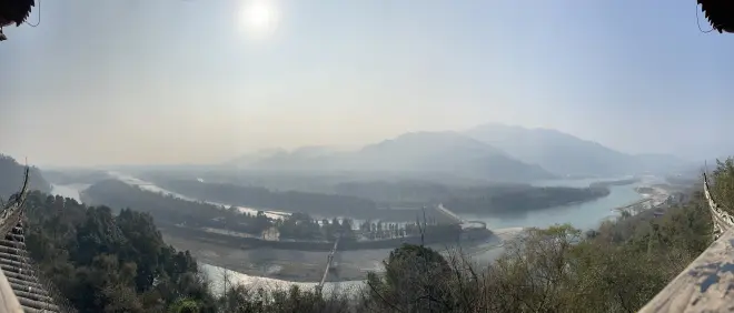 此处是飞沙堰,岷江的水会爱飞沙堰回弹流入成都平原,如果全部流往成都平原又会造成水灾,多的水就是漫过飞沙堰回经过内江到岷江外江