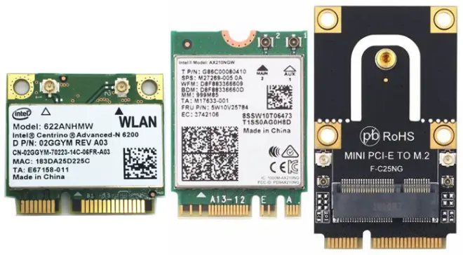 传统无线网卡在网卡端主要有Mini PCI-E(mPCIe)、M.2 A&E-key(两个缺口)和M.2 E-key(一个缺口,与CNVi一样但协议不同)三种种接口,二者可以通过转接电路相互兼容,因而会有诸如转接板、板载M.2转mini-PCIe一体式无线网卡等产品。
