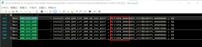 所以我们要做的就是通过修改【netwtw6e.inf】里的硬件ID来「欺骗」驱动,让AX210的ID披上AX1675x的皮,同理修改软件驱动文件【KillerNetworkExtension.inf】欺骗KCC,而【KillerNetworkComponent.inf】不没有规定硬件ID不需要修改。