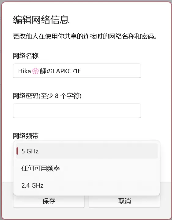 WiFi6并不是6GHz频率,其本身频段仍属于5GHz,因此在网卡和待连接设备都支持AX标准的情况下,将Windows热点的选项切换到5GHz即可。
