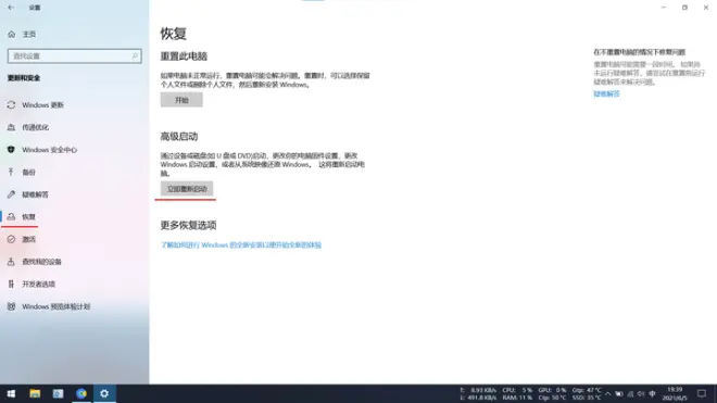 1)【开始】菜单按住【Shift】选择重启,或【设置】-【更新和安全】-【恢复】-【高级启动】-【立即启动】进入高级启动页面;