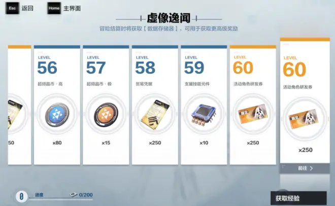 奖励获取需要使用数据储存器升级,可以通过每次旅程结算和成就系统获得,本次没有每日任务,只能慢慢肝,总计可获得1500活动角色研发券与3000贸易凭据。