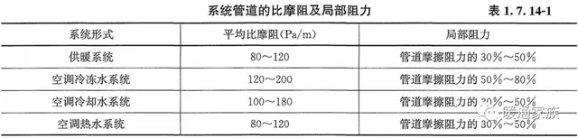 ①、设计流速越高,比靡阻取值越大。由于水系统的附件设置情况(类型和数量)相对固定,因此当水系统的作用半径较大时,局部阻力的比例取较小值。