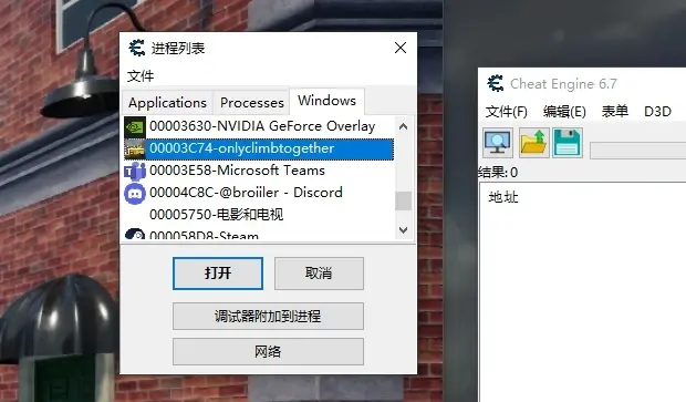 下载后打开游戏并加载人物,打开CE文件夹中的Cheat Engine.exe文件,点击左上角“文件”下方显示器图标,找到only climb游戏进程并打开。