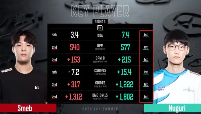 坐镇DWG上路牛国瑞有多么强大?赛前LCK官方对比了牛国瑞与KT上单Smeb的数据,可以看到牛国瑞KDA、DPM、15分钟补刀数、15分钟领先晋级全部排在上单位置第一名,不管是线上能力,还是团战表现,牛国瑞都是LCK上单一线代表,而他在DWG收官战的发挥,也没有让支持自己的粉丝失望。