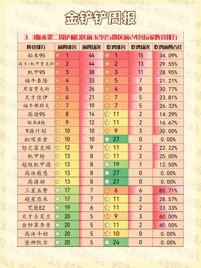 🚩第2⃣️强势阵容 高斗/机甲贾克斯这周吃分场次44场,吃分排名并列第1名,吃鸡场次13场,吃鸡排名第2名。这套阵容的吃鸡前四占比也远高于平均值达到了29.55%。