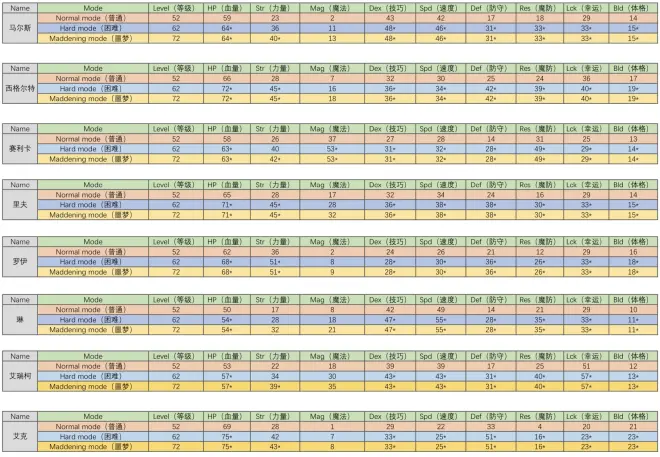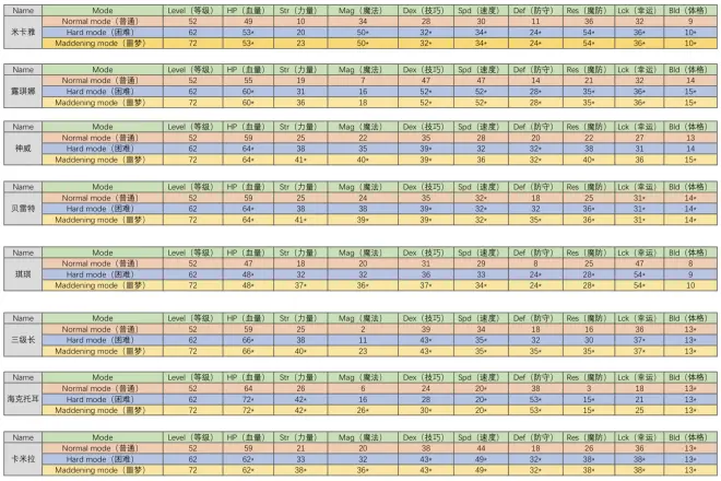 然后还有召唤出来的纹章士的数值,我只记录了小绿人数值,三种难度每种难度的数值也不同