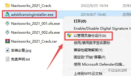 11.返回之前解压的“Navisworks 2021”文件夹,找到并选中“adsklicensinginstalle.exe”文件,鼠标右键选择“以管理员身份运行”