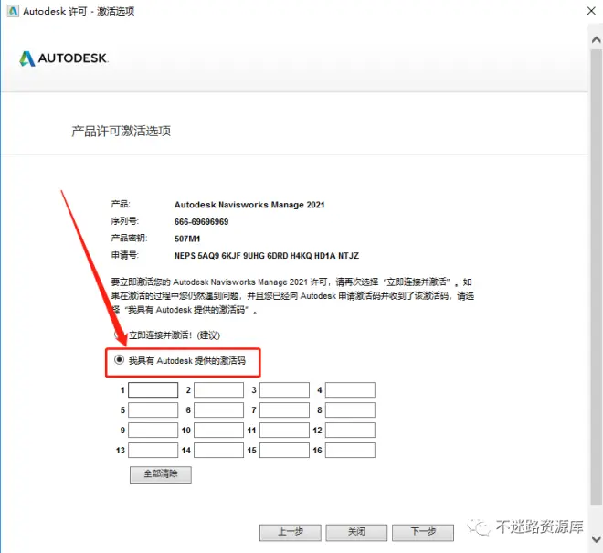 22.将安装界面的“申请码”复制到粘贴到“Request”,点击“Generate”,然后将“Activation”复制粘贴到“我具有Autodesk提供的激活码”对应框内,最后点击“下一步”