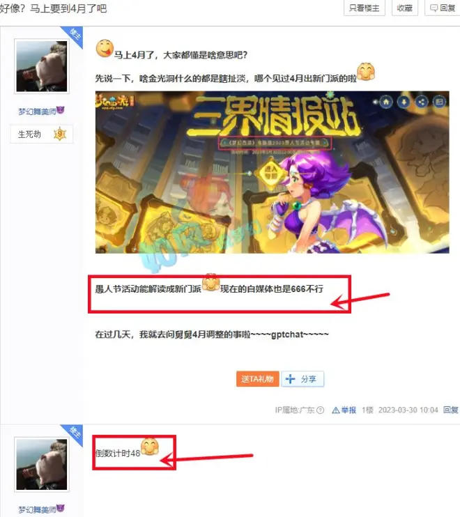 这一点跟如风预测的也基本吻合,新门派金光洞就是个愚人节玩家。除此之外,梦幻舞美师在爆料中还提到了倒计时48,不出意外的话就是再过48小时,他又要开始爆料了,如风将会为你持续关注。