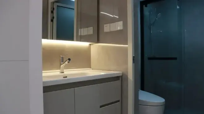 公卫干湿分离的设计,实现功能分区自由,使用上也各不干扰。奶油色的浴室柜组合了镜柜的搭配,简洁的造型带来美观的效果。不失质感的设计给人带来宁静的视觉感受。