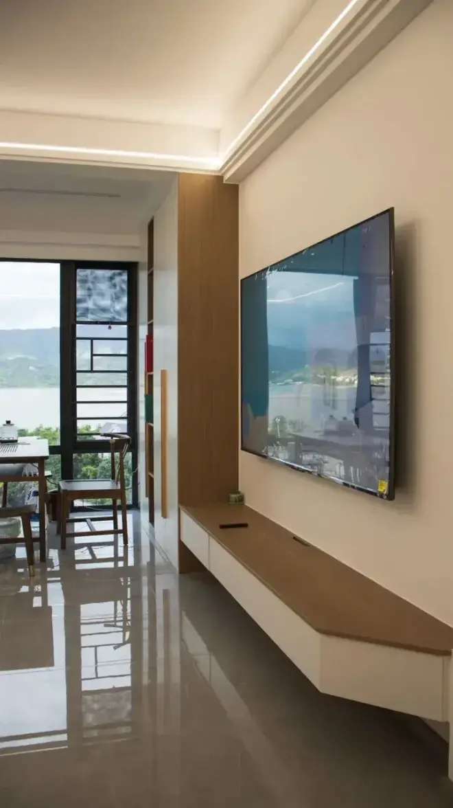 客厅整体配色以白色加木色为主。没有任何修饰的背景墙搭配上柔软舒适的卡其色沙发、悬浮的定制电视柜。色彩上有着明暗、深浅、层次的变化,才不会造成审美疲劳,让人觉得单一。