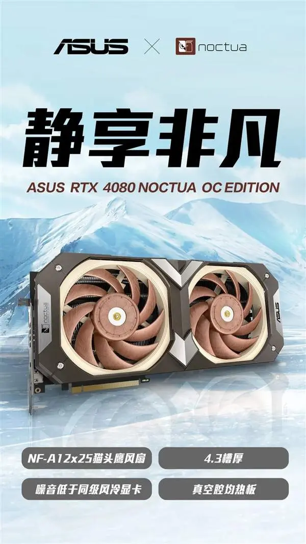 近日,华硕官方宣布,华硕RTX 4080 NOCTUA OC EDITION猫头鹰定制版显卡即将上线发售。