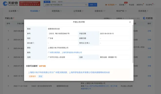 天眼查App显示,近日,EDG关联公司上海阳川电子科技有限公司新增开庭公告信息,被告为广州君沃商贸部等,案由为侵害商标权纠纷,该案将于8月9日在广州市天河区人民法院开庭审理。