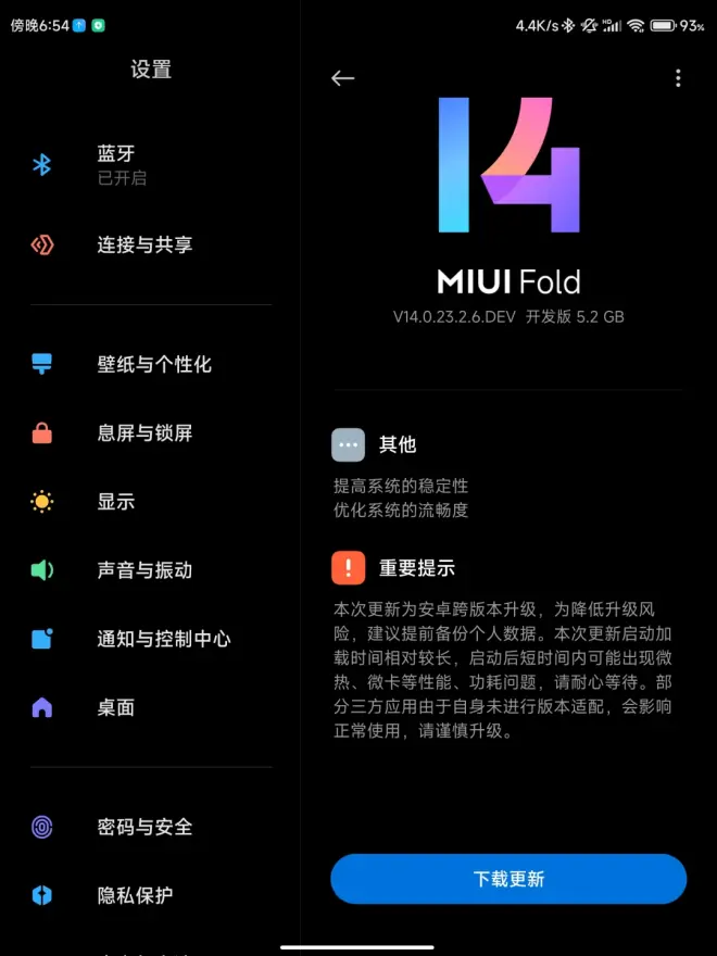 本次 MIUI 14 开发版更新还带来了新的支持机型,就是终于面向小米MIX Fold 推出了首个基于 Android 13 的 MIUI 14 开发版系统,这是小米旗下首款折叠屏旗舰手机,售价 9999 元起。其版本号为 V14.0.23.2.6.DEV,OTA 更新包体积是 5.2GB,更新界面如下图: