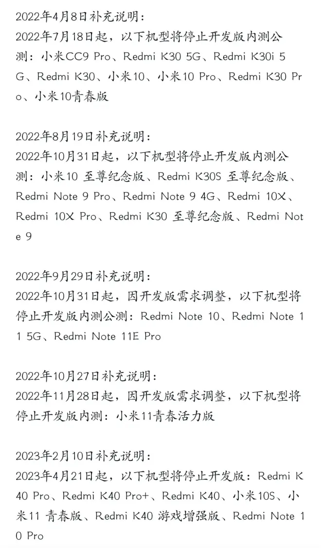 此外,更值得关注的是随着此次更新,小米还宣布了新一批次的 MIUI 开发版停止更新计划,共有 7 款手机,这些机型将从 4 月 21 日起停止开发版系统更新,完整机型名单如下:
