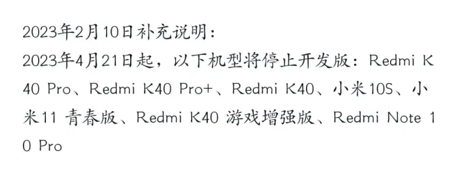 此次停更计划也是小米社区《MIUI 系统开发版策略调整说明》在 2 月 10 日的最新补充说明。在这一公告中,小米官方称从基于 Android 13 的 MIUI 开始,MIUI 将聚焦“开发版”和“正式版”两个版本,MIUI 开发版发布时间为一年,发布超过一年的产品将逐步收回权限。