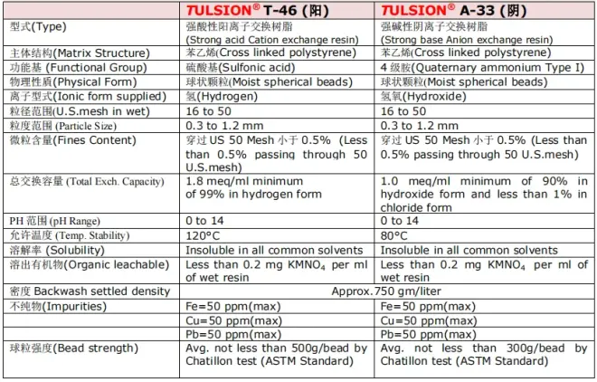 科海思采用超纯水抛光树脂MB-106UP,它是由核子级强酸型阳离子Tulsimer ® T-46Li 及核子级强碱型阴离子 Tulsimer ® A-33OH 以1:2 体积比的剂量比例 , 预先混合的混床级离子交换树脂,专门提供给超纯水系统抛光用。它具有交换容量及优越的物理特性。