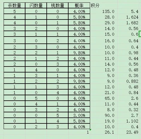 五杀组合135分,五桃组合90分,五闪组合65分,其他的积分是这样的,大家看看表格就可以了: