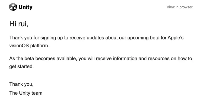 按照视频里面的网址注册了visionOS开发者,得到了 Unity 官方的回信,你收到了吗?