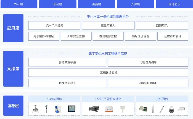 每个方案皆具有完备的架构,提供包含“水利感知层-通信传输层-平台支撑层-业务应用层-应用场景“在内的全流程服务: