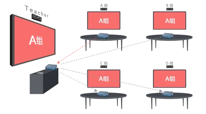 老师可将主屏画面以广播的形式同步推送至各小组分屏。