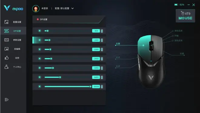 雷柏VT9驱动界面简洁大气,使用起来也很容易上手。可以预存多套配置方案,应对不同的游戏或者工作环境,7档DPI设置,以50为单位步进调节;宏编辑可以实现鼠标按键与键盘按键的录制和编辑。
