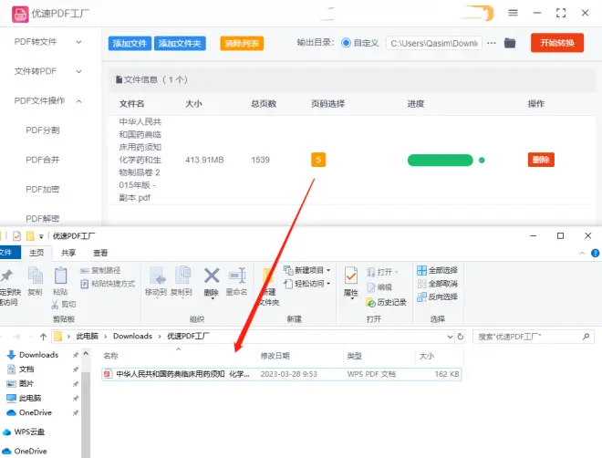 步骤4,设置完成后点击右上角的【开始转换】红色按钮启动软件,提取速度是非常快的,完成提取后软件会自动打开输出文件夹,在这里我们可以查看到提取出来的pdf页面。