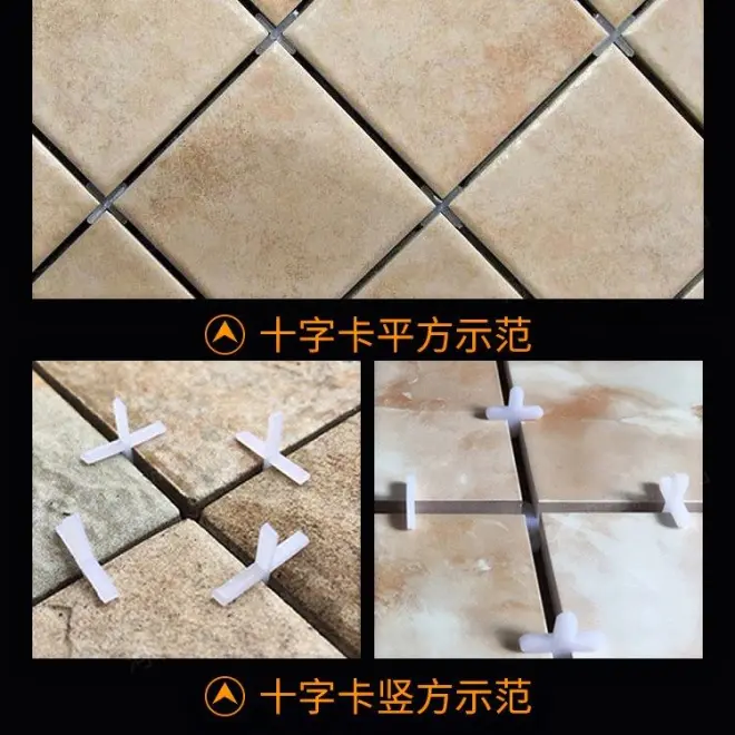 缝隙处理用十字卡扣,缝隙均匀、横平竖直,普通瓷砖留缝2mm最合适,木纹砖留1.5mm,贴完砖及时清理干净缝隙,方便美缝。