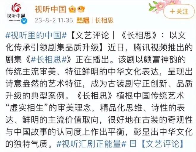 不过,据目前来看,最受欢迎以及口碑最好的,应该属杨紫一奶三的《长相思》,该剧算得上是暑假档第一热剧了。甚至还被央视主动发声打call,称该剧符合主流审美,并且还有鲜明的中华文化特征。能得到央视这么高的评价,可见《长相思》该剧有多能打了。