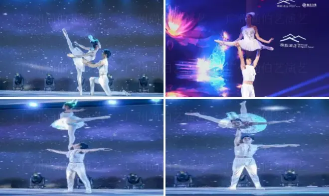 节目介绍:在优雅的音乐声中,女演员在男演员的背上、双肩、手掌和头顶方寸之间轻灵地芭蕾,将芭蕾这 一西方的高雅与神奇的杂技相融 合,杂技变得优雅浪漫,芭蕾变得惊奇震撼,给人以耳目一新的视觉冲击。