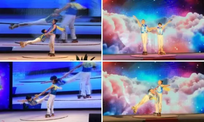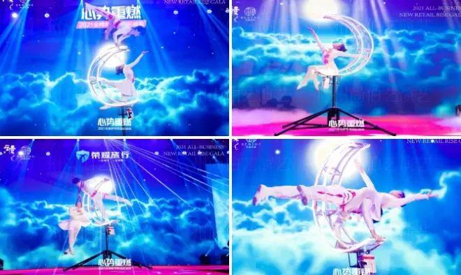 节目介绍:唯美飘逸的两位杂技技巧演员随着 月亮旋转做出高难度技巧与舞姿 相互配合互相依靠支撑 演绎出独 一无二的技巧。