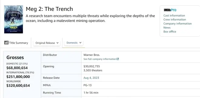 总的来说,这部电影在北美并没有引起轰动,在美国本土的票房只有6800万美元。值得一提的是,由于《巨齿鲨2》的成本很低,这意味着加上线上点播的话,这部电影应该会盈利。而且,这部电影这么快就上了视频点播,意味着华纳影业认为,这部电影在家庭平台上会表现的更好。