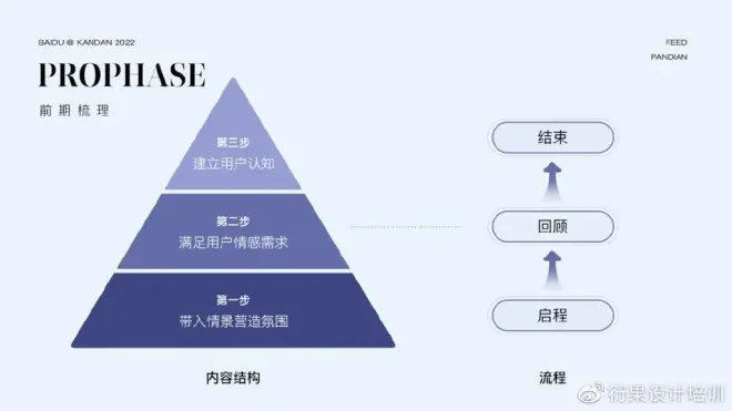 随着近年来各个大厂的年度盘点设计体验的不断升级,盘点页面的内容结构也呈现出固定化和同质化。我们把市面上的页面流程分为三部分,启程,回顾,结束,分别对应三步内容结构,带入情景,满足需求,建立认知。