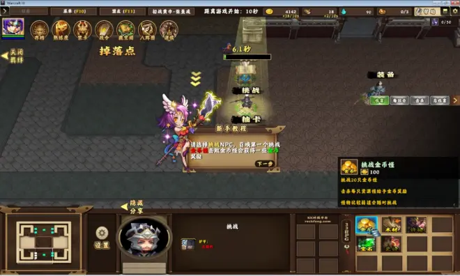 另外,所有挑战内容都集中于此npc处,前期叫挑战别太猛,我们场上的英雄未能成型之时,还是保守一点来得好,待到羁绊成型那就cd到了就拉挑战,其中神器挑战有一定的次数限制,而许诸的挑战则相当于一个可控的金猪挑战,我们可在波次间隙中进行挑战。